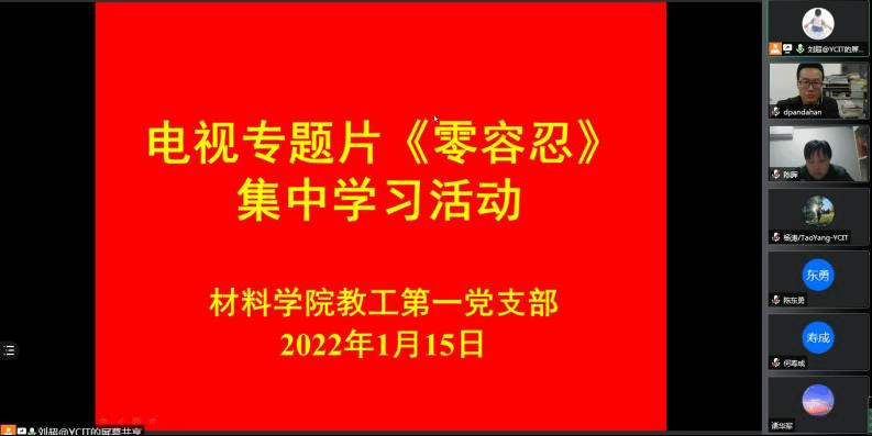 2022年1月15日晚上20:00,6165cc金沙总站检测中心教工第一党支部以腾讯会议的形式,开展了电视专题片《零容忍》第一集《不负十四亿》集中学习活动,6165cc金沙总站检测中心教工第一党支部20余名教工党员参加,活动由支部书记刘超主持,支部委员韩朋德和陈晖共同组织。