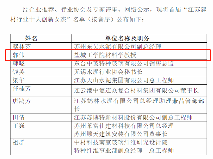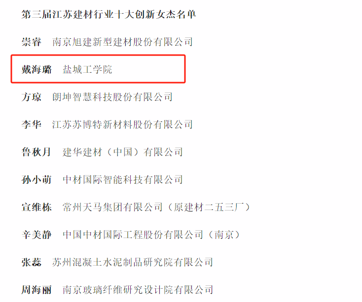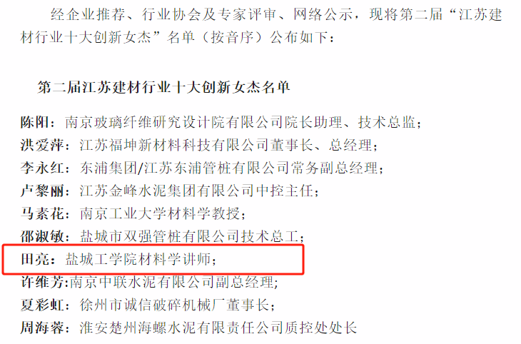 为贯彻党的二十大精神,庆祝三八国际妇女节,树立行业女性典范,展示杰出女性为建材行业高质量发展做出的重要贡献和奋发有为的精神风貌,省建材行业协会连续三年组织了江苏建材行业十大创新女杰推荐评选活动。经会员单位推荐、省协会及专家评审,6165cc金沙总站检测中心学院教师郭伟、田亮、戴海璐等3名女教师,分别连续三届荣获“江苏建材行业十大创新女杰”称号。